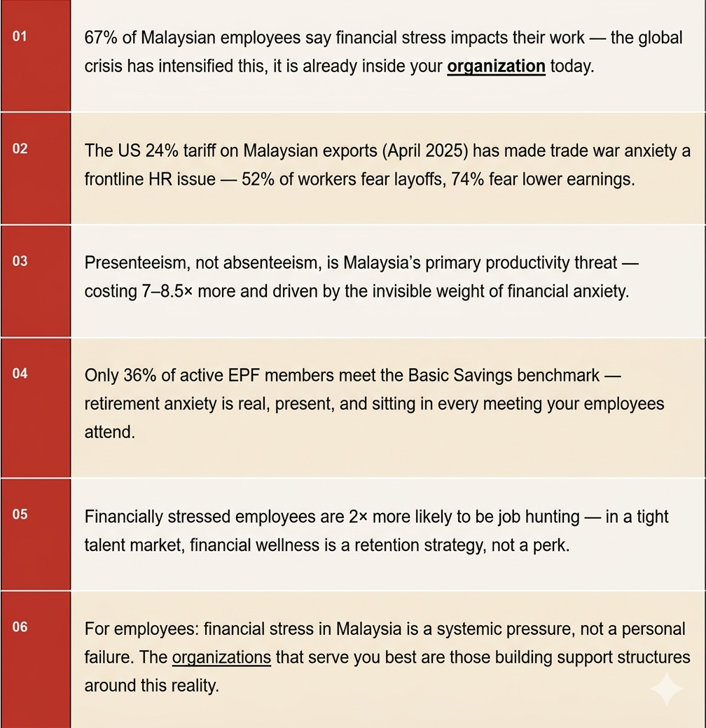 For individual employees reading this: if you recognise yourself in these descriptions, you are not alone and you are not failing. Financial stress in Malaysia today is a systemic pressure- amplified by global trade disruption, policy shifts, and structural gaps in the financial safety net -not a reflection of your discipline or character.